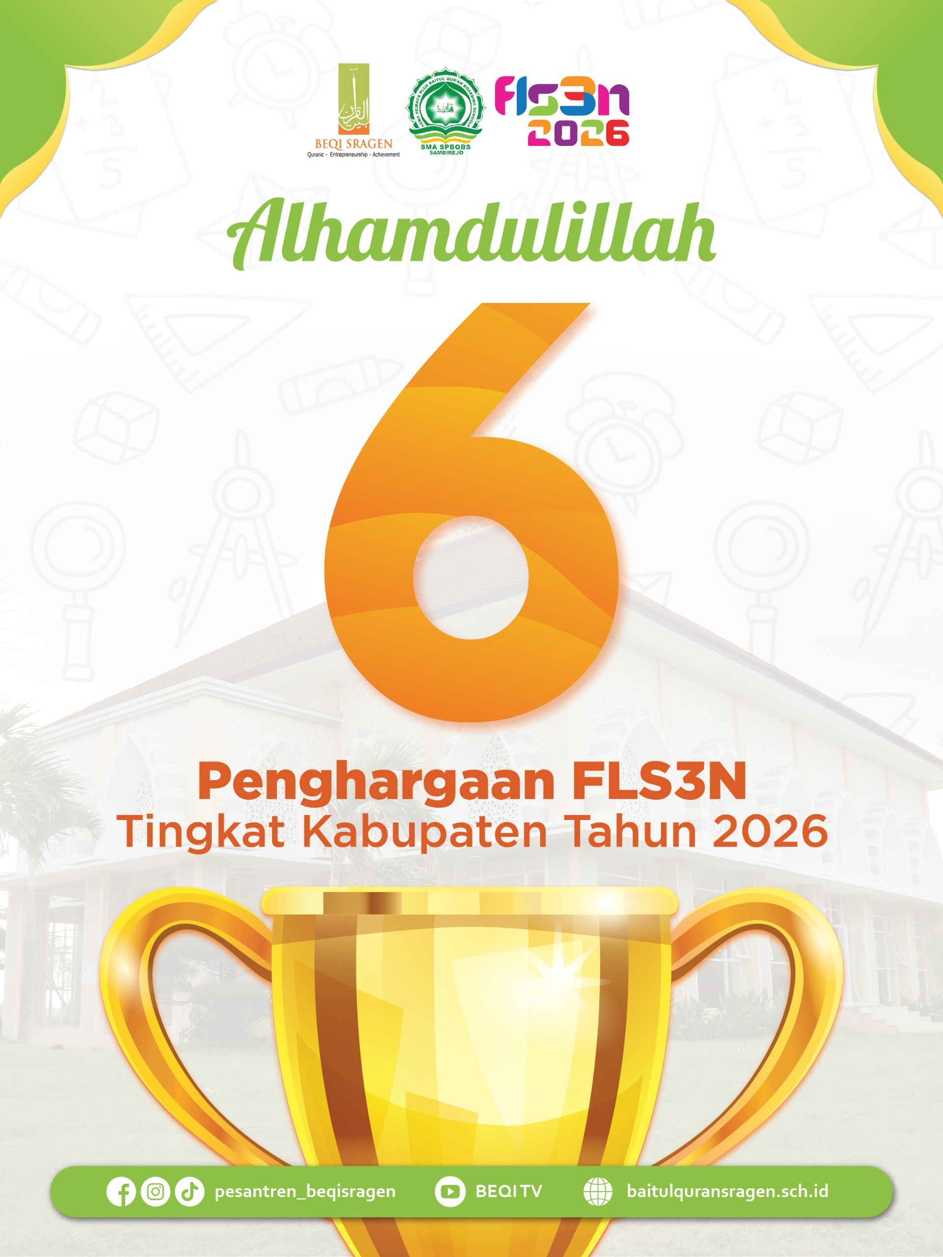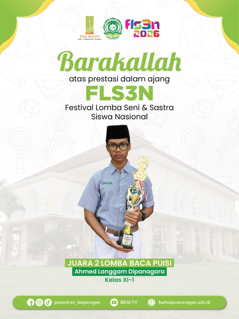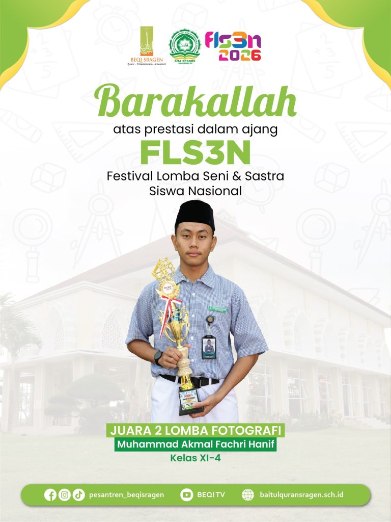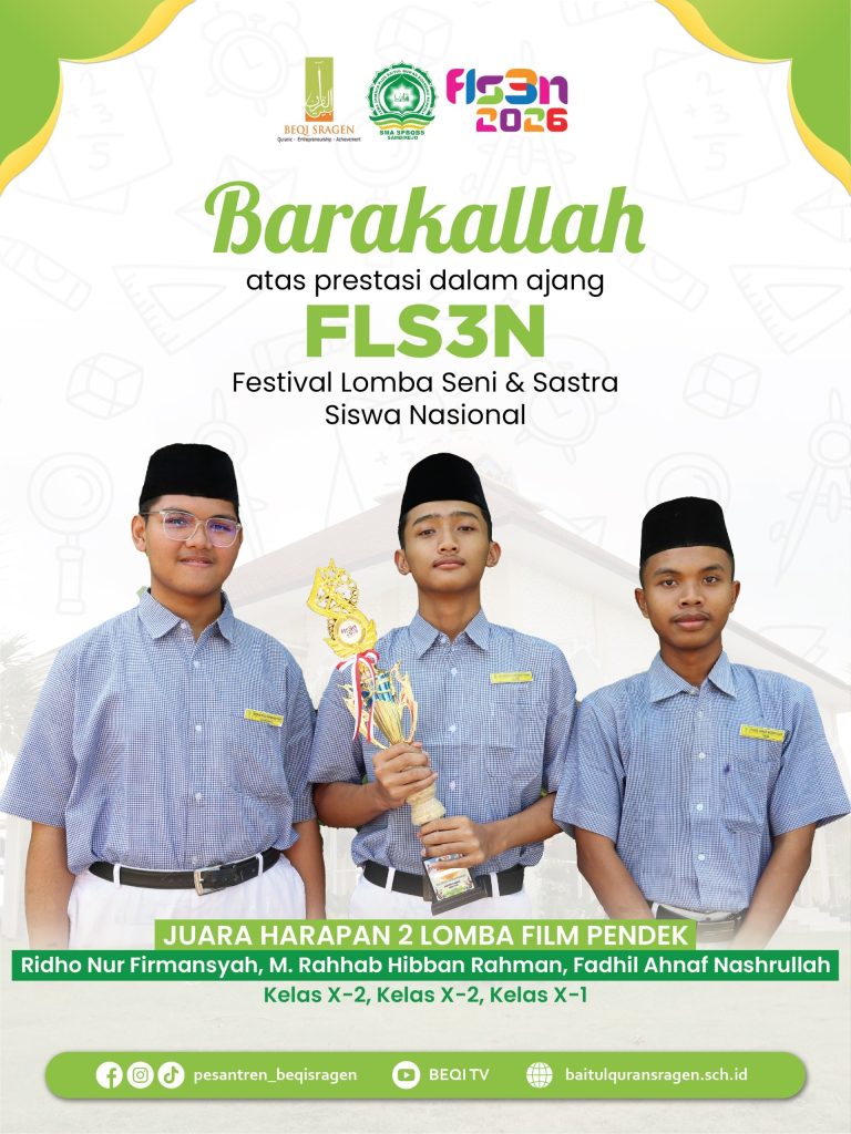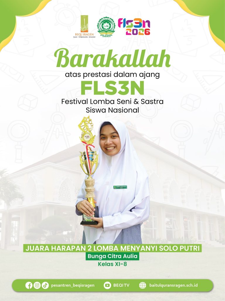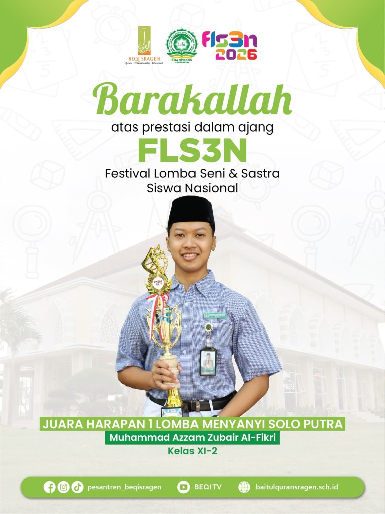 Enam santri berhasil meraih prestasi dalam ajang Festival dan Lomba Seni Siswa Nasional (FLS3N) 2026 jenjang SMA tingkat Kabupaten Sragen. Capaian ini menjadi bukti nyata komitmen pesantren dalam mendukung pengembangan bakat dan kreativitas santri di bidang seni.